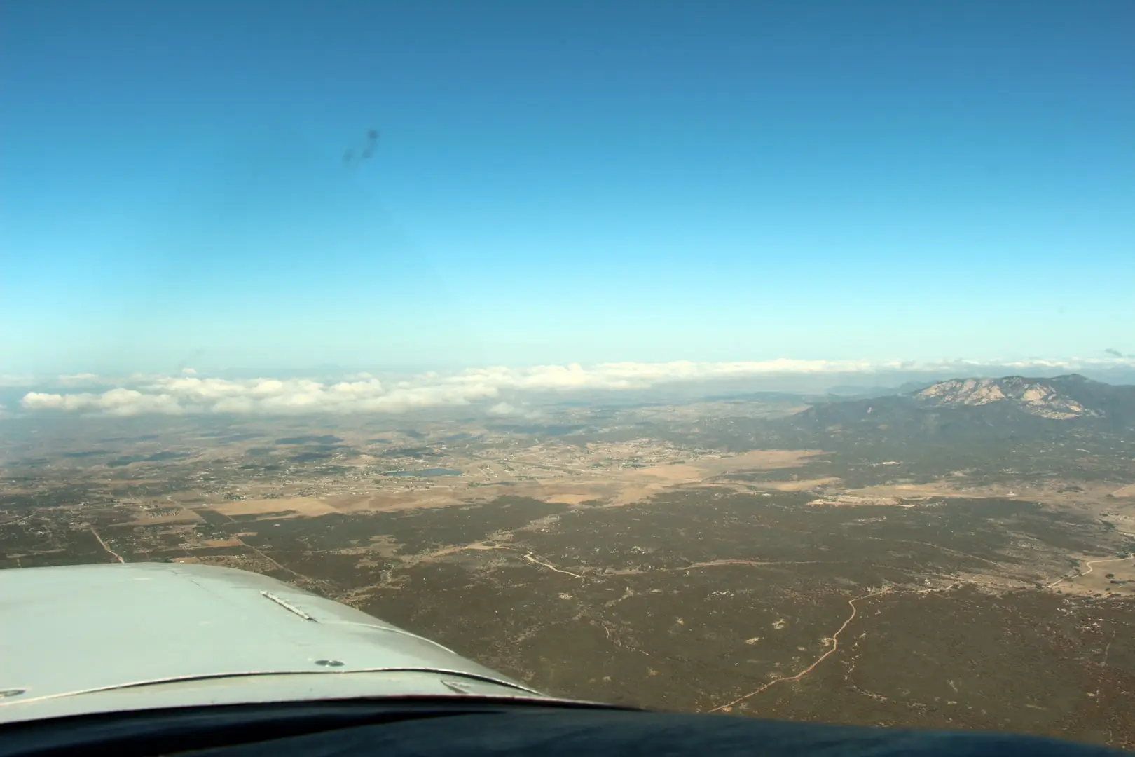 After once again setting up my flight on the tablet I took off on 26, turned crosswind, and then downwind without decreasing my climb rate. By mid-field I was at 2,200′ (Traffic Pattern Altitude is 1,518′) and turned north crossing over the field before heading off to the north-west. A short climb to 6,500′ and I settled in for the short flight back. There were some patchy clouds that I was flying above, but I knew that I would need to get below. Corona was showing clear, but I didn’t know at which point between French Valley and Corona it would go from “Scattered” to “Clear” and I didn’t want to arrive close to Corona with 6,000′ to descend. As I approached French Valley I saw a big break in the patchy clouds so I pushed the nose over to head down through it and under the clouds ahead.